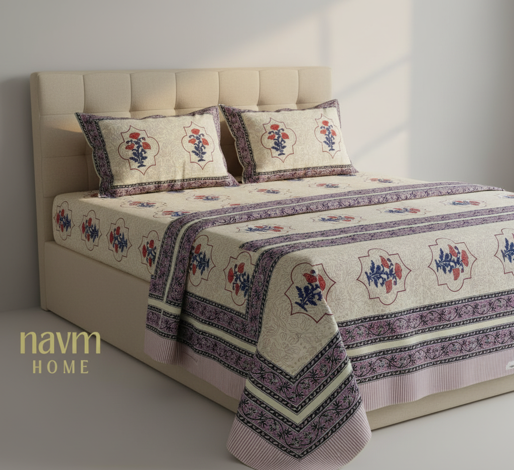 Hand Block Printed Cotton Bedsheet & Pillow Covers – King Size (Jaipur-Inspired Patterns)